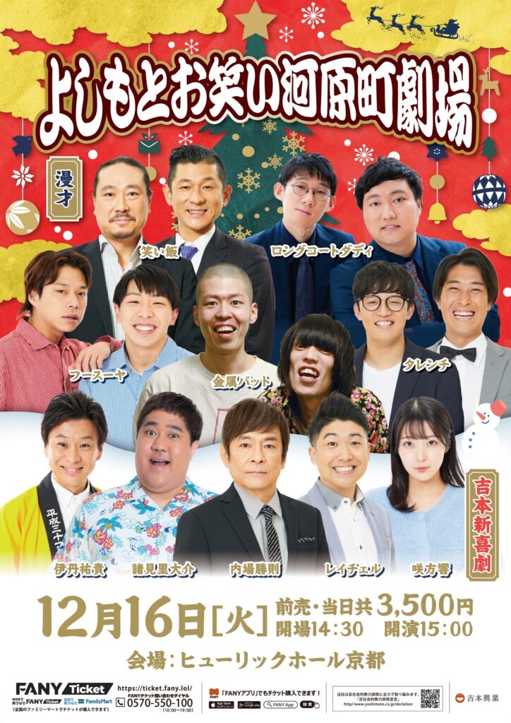 イベント情報 開催日:2026年12月16日 よしもとお笑い河原町劇場 よしもとお笑い河原町劇場 日時 : 12月16日(火) 開場 14:30 開演 15:00 会場 : ヒューリックホール京都 チケット : 前売・当日共 3,500円 FANY Ticket https://ticket.fany.lol/ FANYチケット問い合わせダイヤル 0570-550-100 出演 ◆漫才 金属バット タレンチ フースーヤ ロングコートダディ 笑い飯 ◆吉本新喜劇 内場勝則 諸見里大介 レイチェル 伊丹祐貴 咲方響